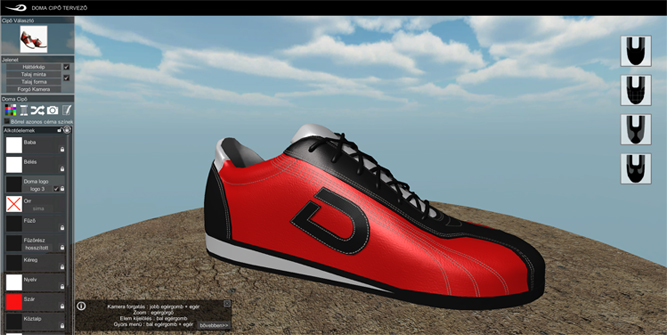 A Doma Cipő Tervező egy korszerű webes 3D alkalmazás, melynek segítségével könnyedén, szinte néhány kattintással tervezhetsz egyedi cipőket saját magad, vagy szeretteid számára.